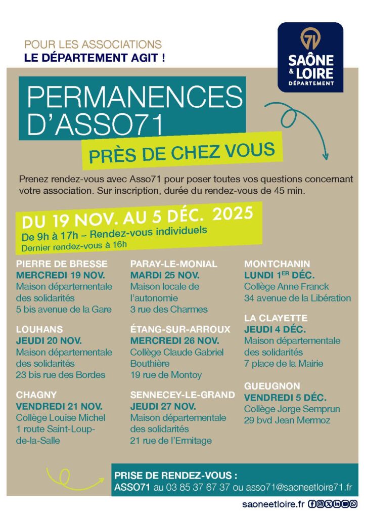 Le Département et son service Asso71 organisent prochainement une série de permanences de proximité à destination des associations du Département. Les dirigeants associatifs pourront prendre rendez-vous individuellement avec les agents