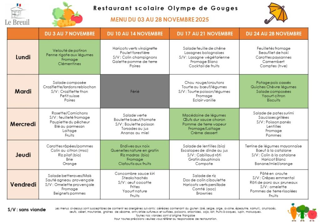 Menu du mois de novembre 2025