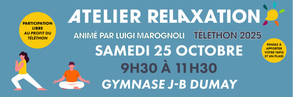 Dans le cadre du Téléthon 2025, la Ville et le CCAS du Breuil vous invitent à un atelier relaxation animé par Luigi Marognoli, le :